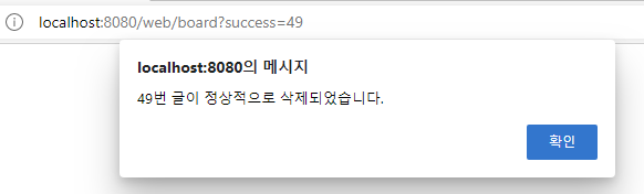 게시글을 삭제한 후 다시 board.jsp로 돌아가게 되는데 이 때 JS로 파라미터값을 조회했을 때 success라는 파라미터가 있다면 "OO번 글이 정상적으로 삭제되었습니다."라는 메세지를 보여주는 방식입니다.
